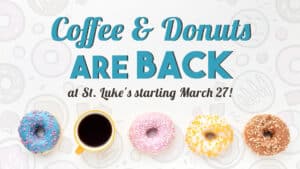 We are so excited that donuts and coffee fellowship is coming back this week! It’s been just over two years since we all gathered in the Rotunda after worship and listened to the buzz of conversation and laughter. We have made light of it in the past, making it about the donuts (which if you are new, I promise you they are really good). But truthfully, it’s about the moment and feel in the Welcome Hall that happens when St. Lukers come from both worship venues, it is actually one of those Kingdom of God moments. It’s the moments when you can visibly see, hear, and feel the core values of Christ-centered love being expressed through Acceptance, Hospitality, and Community. It will be so good to gather with you after worship this week and reconnect in this important experience as a body of Christ.