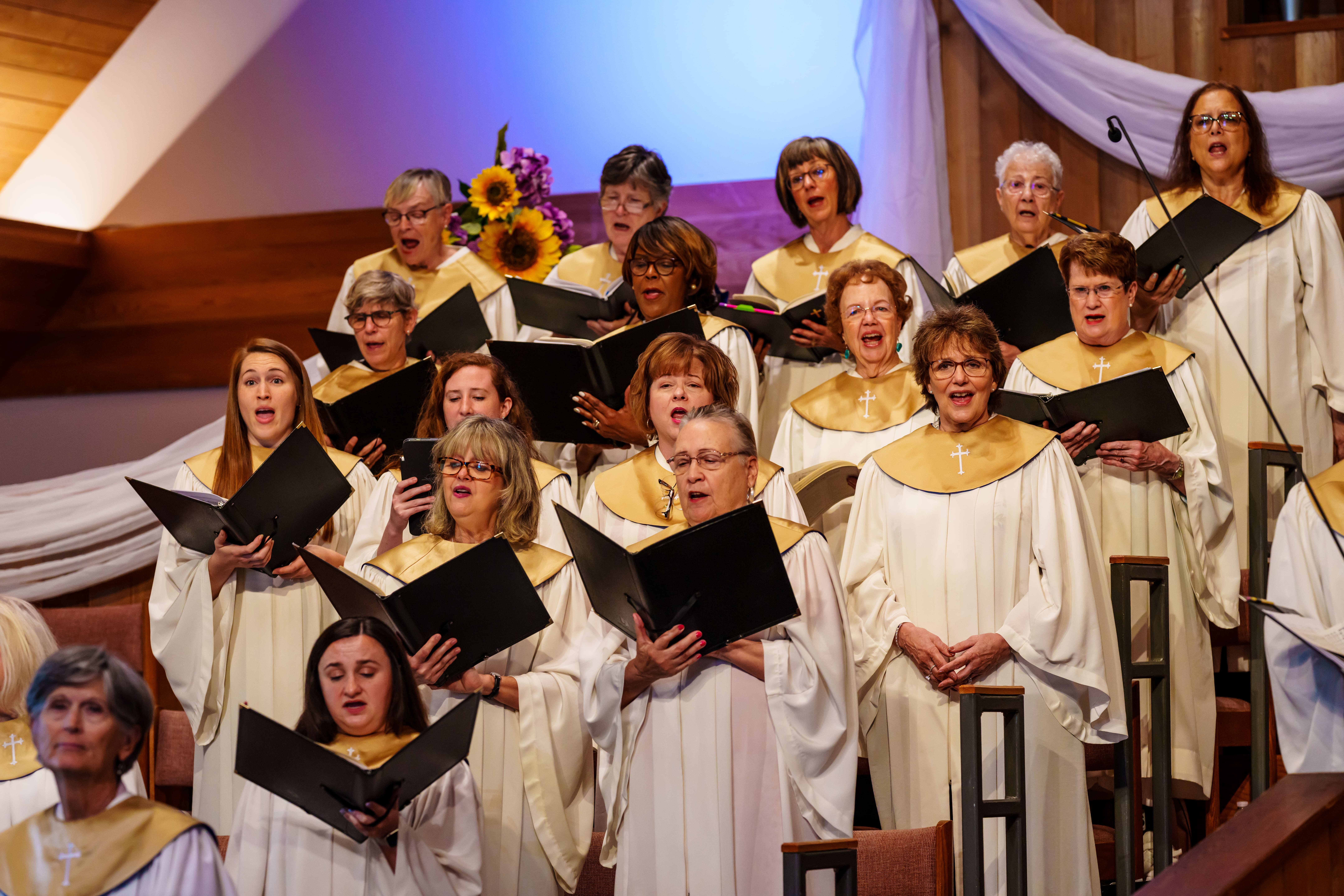 We rehearse every Wednesday evening from 7:00–9:00 p.m. in the Choir Room upstairs in Building B, across from the Sanctuary. Use the single door with the sign on it, take the stairs or elevator to the second floor, and head to the end of the hall.
