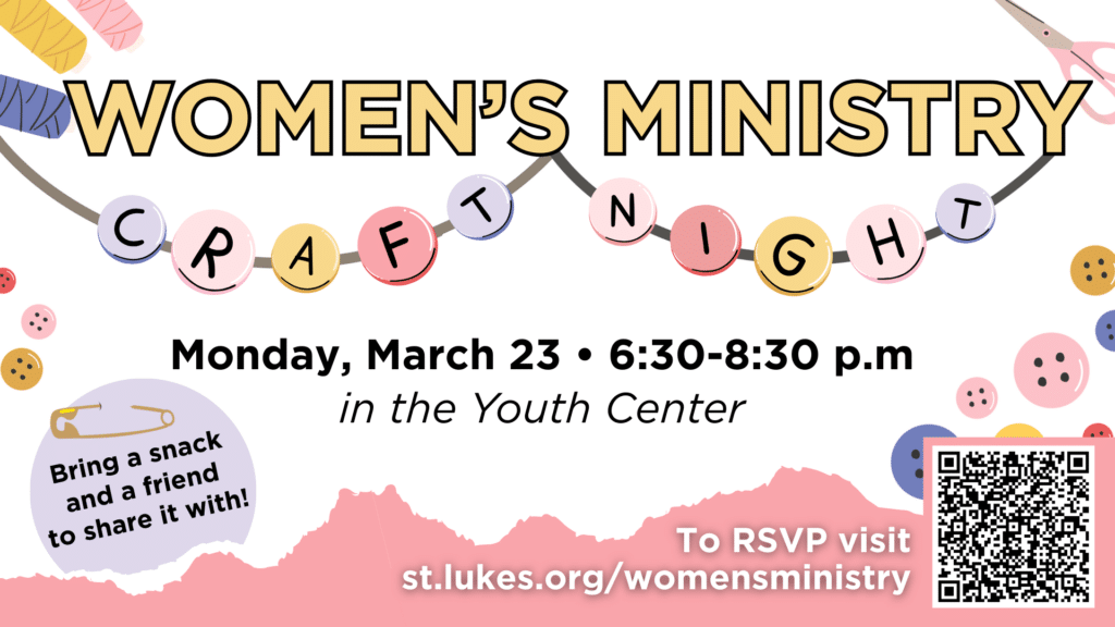 Join St. Luke’s Women’s Ministry for a joyful evening of creativity and connection as members of United Women in Faith share some of their favorite handmade crafts. From cards and bookmarks to simple jewelry and more, there will be something for everyone — no experience required.