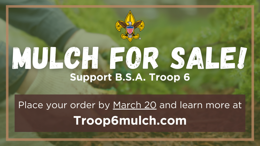 Please support your local scouts by purchasing mulch from BSA Scout Troop 6. The proceeds help the scouts fund their week-long summer camps and high adventure camps.